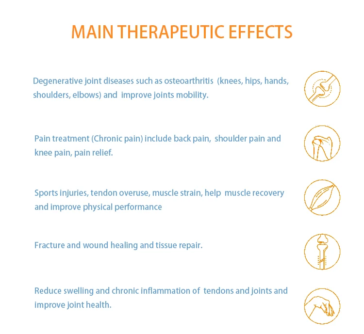 筋骨格系疾患、スポーツ傷害、慢性炎症などに使用できます。