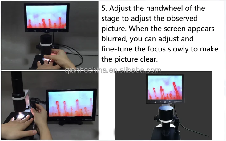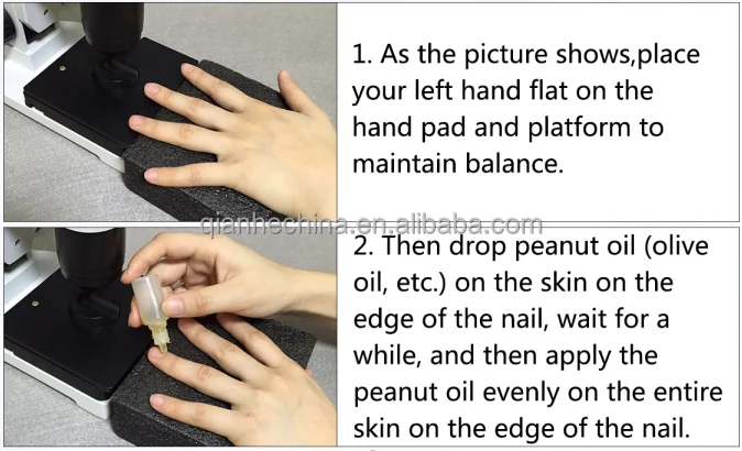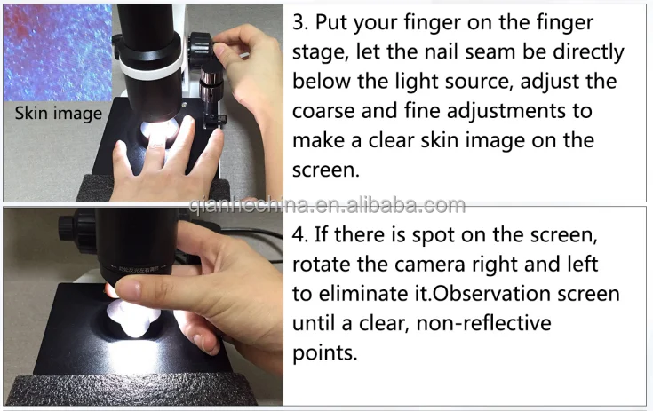Sätt fingret på fingerbordet, låt nagelsömmen vara direkt under ljuskällan, justera grov- och finjusteringarna för att få en tydlig hudbild på skärmen.